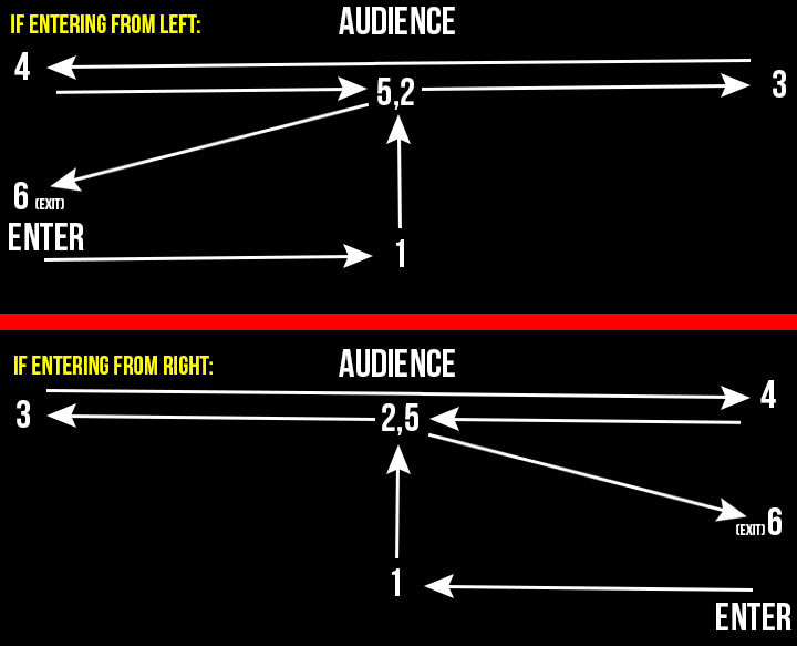 “I” Walk – Competitors walk directly to the rear center of the stage, which will be marked with an “X.” They will pause briefly in a pose of their choice, then walk directly to the front center stage, which will also be marked with an “X.” Here they will perform quarter or half turns with poses of their choice to provide a full view of their physique. They will then exit the stage. “I” walks are performed to house music. Athletes should be prepared to enter and exit from either side of the stage as different venues have different stage layouts.